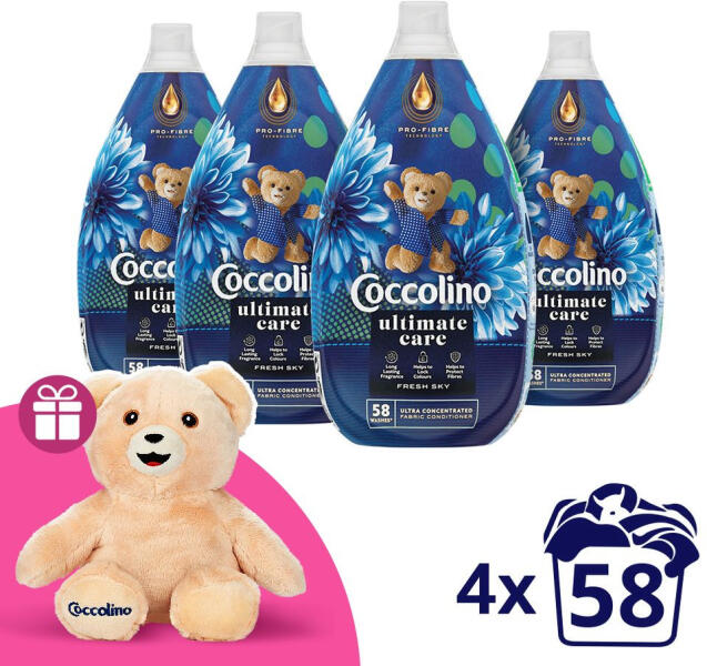 Az új Coccolino Ultimate Care Fresh Sky öblítő forradalmi Pro-Fibre technológiával készül. Segít megvédeni a ruhák élénk színét és nyomott mintáját, hogy az új ruháid hosszan tartóan újnak nézzenek ki! A csomagtermék 232 mosáshoz elegendő.