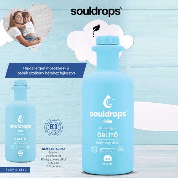 A babák bőre nemcsak puhább, de egészen másképp működik, mint a felnőtteké. Emellett sokkal érzékenyebb is, ezért például az sem mindegy, hogy milyen tisztítószereket használunk a babaruhákhoz.  A Souldrops baby termékek a legmakacsabb foltokkal is elbánnak, legyen szó egy kakaóval elázott bodyról, egy saras játszótéri nadrágról, vagy éppen egy plüssmackóról, ami egy ""rejtélyes"" kaland nyomait viseli magán. Emellett pedig egytől-egyig bababőrbarát összetevőkből állnak, így még a legérzékenyebb bababőrrel is gyengédek maradnak.