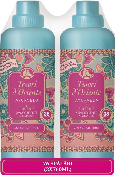 Tesori d'Oriente Ayurveda öblítő, 76 mosás, 2x760 ml Tesori d'Oriente Ayurveda mosodai kondicionáló csomag 2x38 mosás, 2x760ML. Frissítő citrus illat, pacsuli aroma, amla olaj... az AYURVEDA mosodai kondicionáló krémes formulájában, amelyet arra terveztek, hogy helyreállítsa a ruha jó közérzetét.